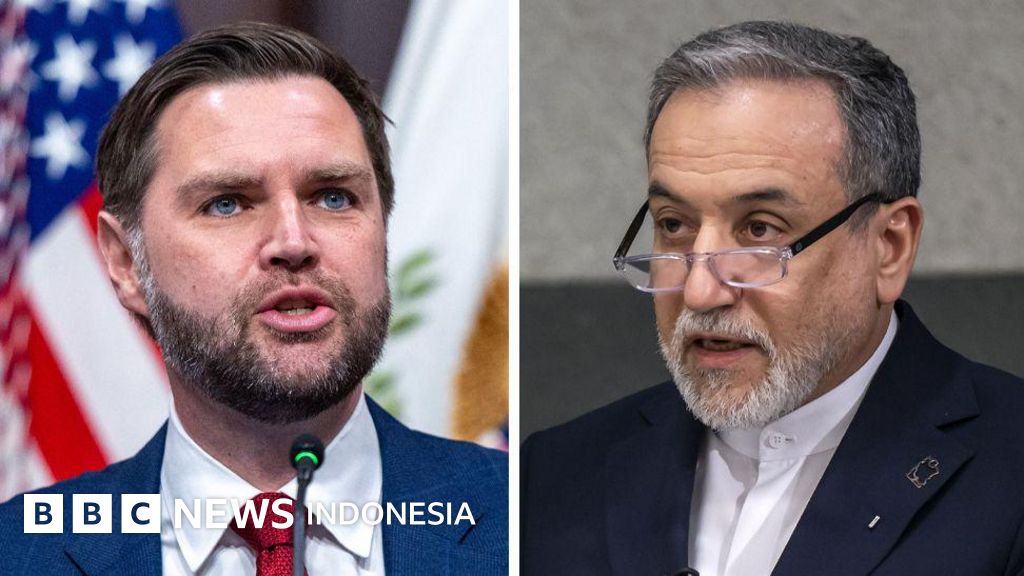Podpredsednik ZDA JD Vance, oblečen v belo srajco, rdečo kravato in modro obleko pred ameriško zastavo, medtem ko govori na dogodku, na sestavljeni sliki poleg iranskega zunanjega ministra Abbasa Araghchija, ki je viden govoriti na sivem ozadju, medtem ko nosi očala, belo srajco in črno obleko.